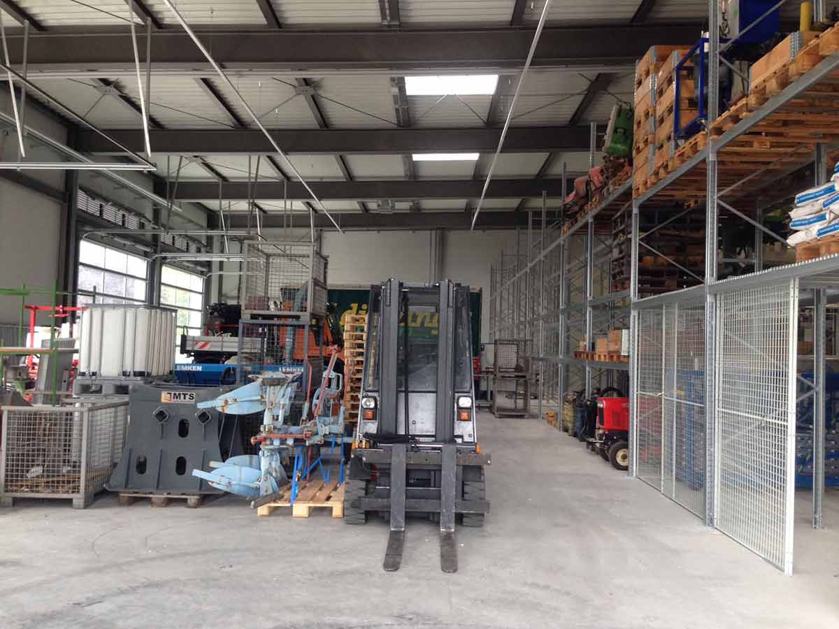 - den rückwärtigen Teil mit drei Reihen Industrieregalen