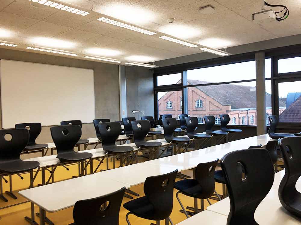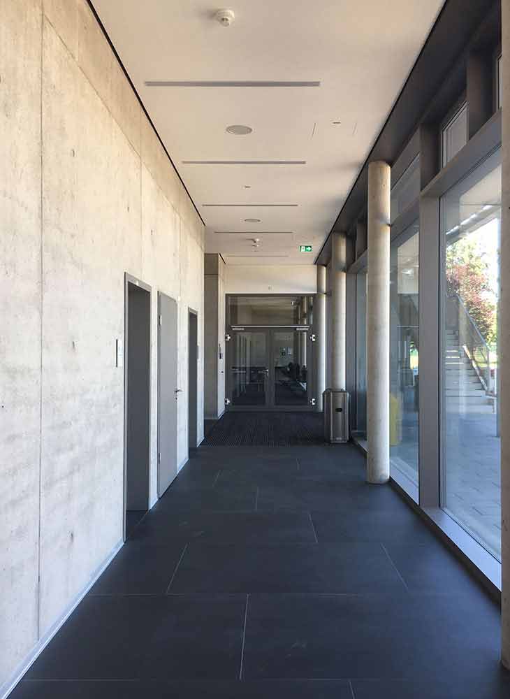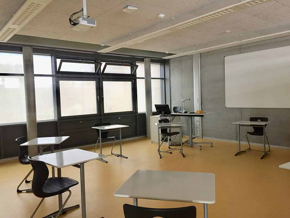 Die Erschließung des Gebäudes erfolgt über offene Treppen und einen offenen Laubengang. Damit werden die Theorieräume beidseitig natürlich belichtet und belüftet.