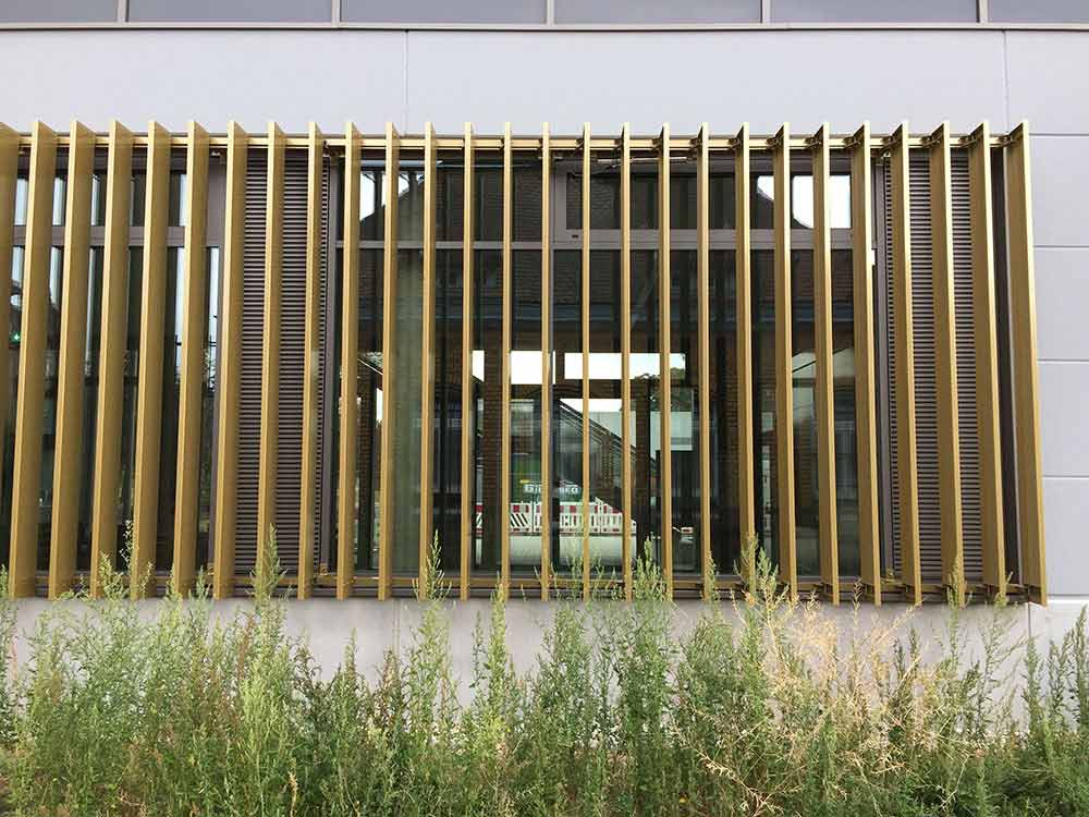 Wichtig war uns die Lage des Gebäudes /des Pausenraumes zur Fritz-Roth-Straße hin, so dass das Leben in der Schule für die Nachbarn sichtbar wird. Auch hier sind die Fassaden Teil des Gestaltungskonzeptes für alle Neubauten inklusive der Lärmschutzwände: Gasbetondielen, die eine horizontale Rasterung vorgeben.