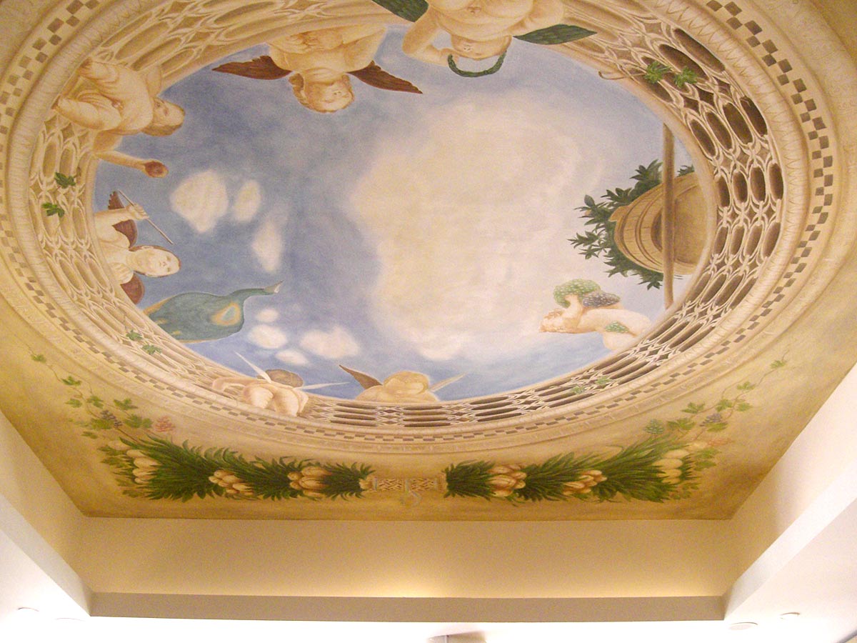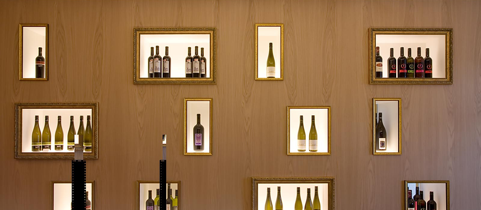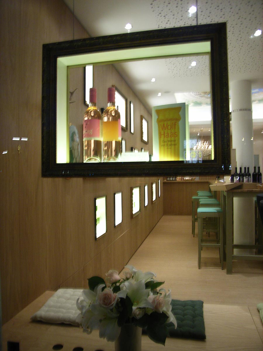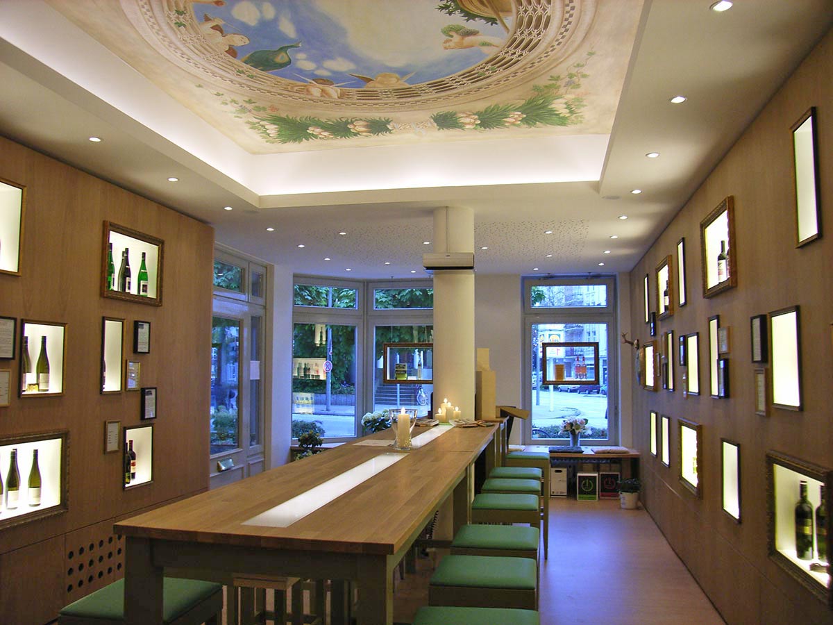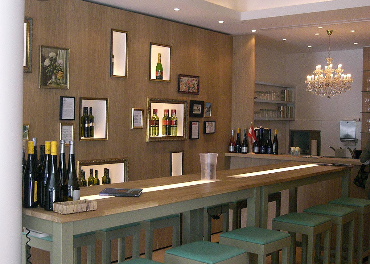 Unser Entwurfskonzept ist die Bilderwand – die Weine werden wie Bilder verschiedener Größe in kostbaren Goldrahmen gezeigt. Jedem Winzer stehen drei Rahmen übereinander zur Verfügung, in denen seine Weine präsentiert werden. Diese Wein-Bilder wurden inzwischen mit "richtigen" Bildern und Objekten aus dem Weinviertel ergänzt, dazwischen hängen Informationen über Winzer und Weinberge oder Preislisten. Zwei beleuchtete Bilderrahmen hängen frei als Schaukästen in den beiden Fenstern zur Straße. Sitzmöglichkeiten bieten der lange, österreichisch kommunikative Tisch in der Mitte oder die tiefe Fensterbank am Eingang. Die Decke ist abgehängt, um Strahler einbauen zu können und Akustikplatten (Streulochung wie Sektperlen) zu integrieren, um einen störenden Unterzug verschwinden zu lassen – wesentlich aber, um über dem Tisch eine Fläche mit maximaler Raumhöhe zu definieren, die dank dem "barocken" Deckengemälde den Blick in den (Wein-)Himmel öffnet.