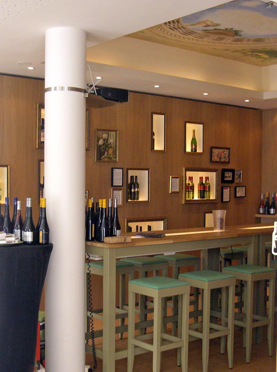Das Weinviertel hat die Farben grün und beige – so das Briefing durch die Auftraggeber: Wir setzen dies um mit dem Eichenholzton von Wänden und Fußboden, den grünen Flaschen in den Kästen und grünen Polstern auf den Hockern, ergänzt durch das Gold der Rahmen. Kronleuchter und Deckengemälde verstärken den Eindruck von kultivierter, österreichischer Gastlichkeit.